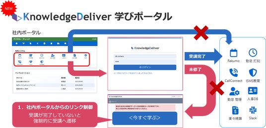 「学びポータル」は、eラーニングの受講が未完了の場合、他のツールの利用時に注意喚起を行ったり、自動でeラーニングの受講画面に遷移させたり、ツールの利用に制限をかけたりすることができる仕組みです。これにより、生徒や受講者が、学習のタイミングを逃さず、スムーズに受講へ進めるよう支援します。