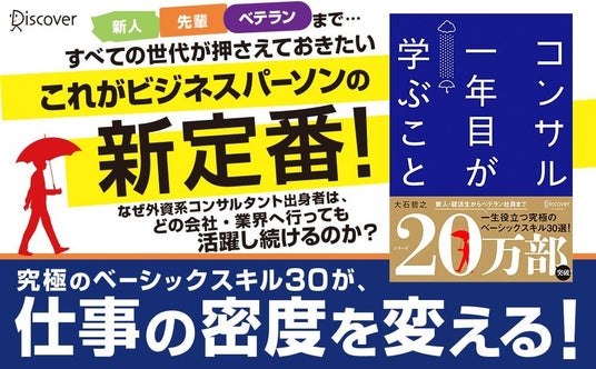 2014年に発売されて以来、10年近く売れ続けているロング&ベストセラー『コンサル一年目が学ぶこと』は、一流のコンサルタント会社を経て独立し様々な業界で活躍している方々に取材した結果見えてきた、コンサルタント時代で学んだ中で今でも実践している、外せない「ビジネス基礎」スキルを30紹介しています。