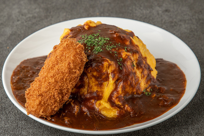 エビフライに蟹クリームコロッケ、さらに和牛メンチカツを2個乗せた、お子様ランチならぬ“大人様ランチ”の風情のオムライス。強者はさらにトッピングを追加しているという噂も…洋食の人気スターたちの競演をお楽しみください。