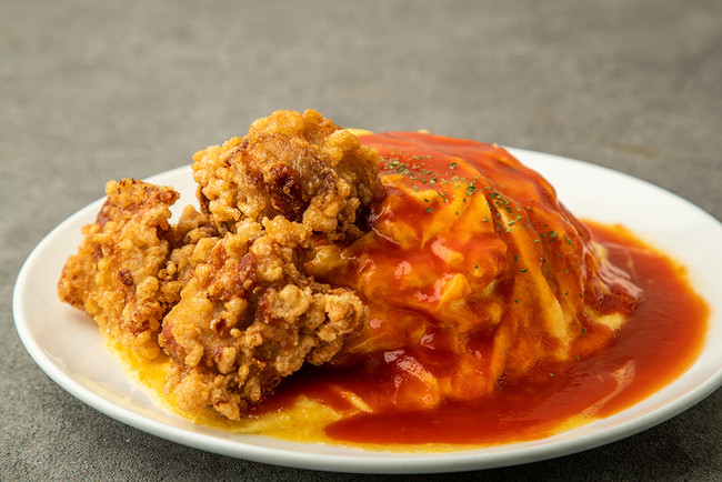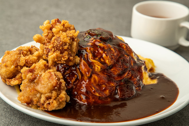 見目麗しき半熟卵オムドレスに香味野菜の旨みが溶け込んだ濃厚なデミグラスソース、そこにサクサクを通り越してザックザク衣の唐揚げが3個、豪快に鎮座!週の始めにテンション爆上がりさせてくれるランチをぜひどうぞ。