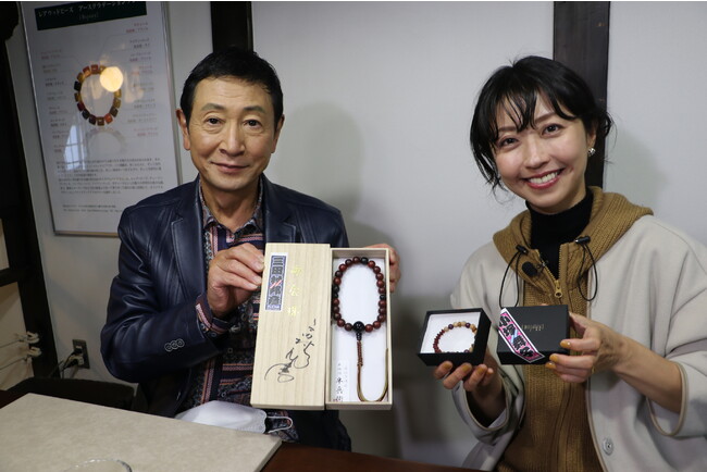 再び八幡堀に戻ると木製の数珠やアクセサリーを扱うお店へ。近江八幡は聖徳太子が1400年前に数珠づくりの技術を伝授したと言われている木製数珠の一大産地。そんな土地で三田村は数珠、小塚はプレスレッド作りに挑戦します。