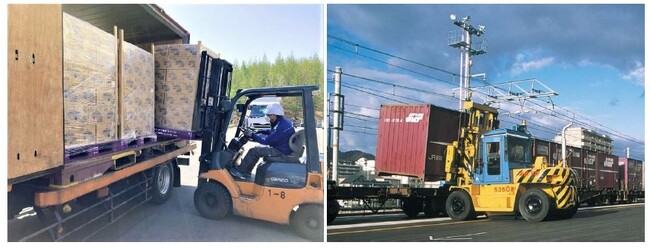 このたび、貨物鉄道輸送を活用するにあたり、鉄道用コンテナへの積み込み方法や輸送時の製品への負荷検証を重ねた結果、製品の品質保持が確認できたため、総合的に効果が得られる物流センターを選定し、貨物鉄道輸送の活用を進めてまいります。