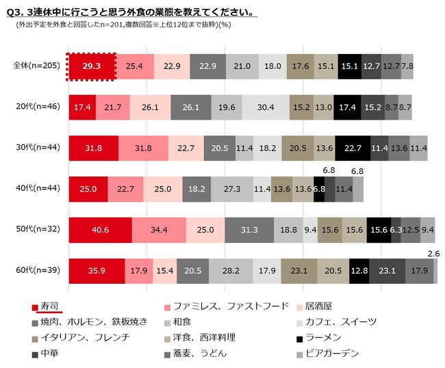 ・行きたい業態は「寿司」「ファミレス・ファストフード」「居酒屋」がTOP3。