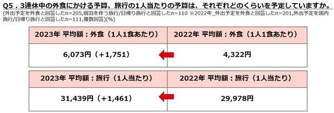 ・外食の予算は平均で6,073円、旅行は31,439円。昨年と比較すると上昇傾向。