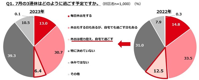 ・7月の3連休は「毎日外出する」が13%、「外出する日もあるが自宅で過ごす日もある」が31%、「外出は控え自宅で過ごす」は昨年に比べ半減。