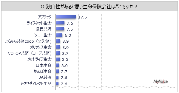 独自性があると思う生命保険会社は(複数回答)、「アフラック」が17.5%、「ライフネット生命」「県民共済」「ソニー生命」が6~8%です。