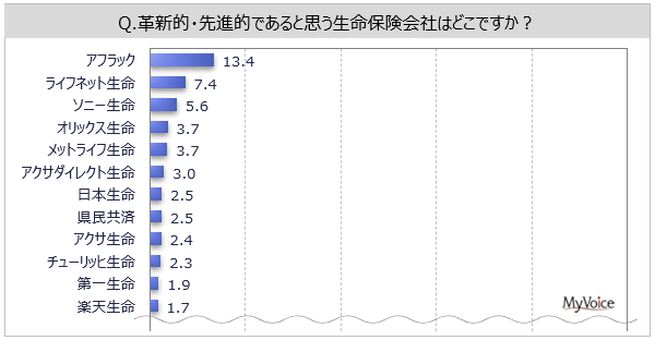 革新的・先進的であると思う生命保険会社は(複数回答)、「アフラック」が13.4%、「ライフネット生命」「ソニー生命」が6~7%です。「いずれもない」が6割強となっています。
