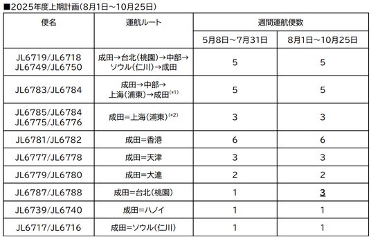 JALは、2025年3月3日発表の国際線貨物専用機(フレイター)の2025年度上期路線便数計画について、8月1日以降の計画を以下のとおり変更します。