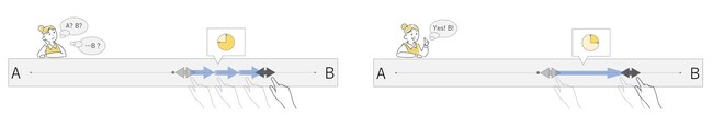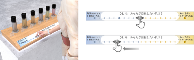 本製品は、横に細長いサイネージ上に質問と回答を同時に表示させ、質問の回答のより近い方に指をスワイプすることにより「Yes/ No」の2択だけでなく、回答にかかった時間やスワイプの速度などの要素を加味し、利用者の回答の曖昧なニュアンスまで汲み取って商品のレコメンドを行う製品です。