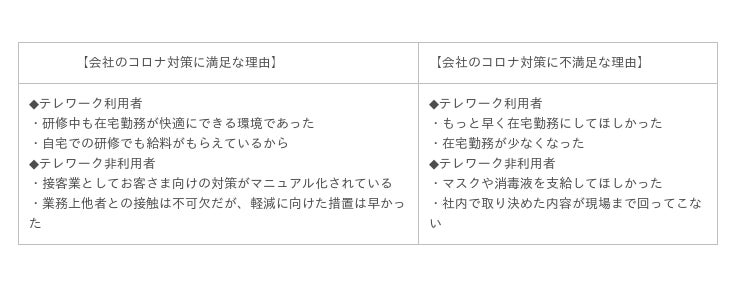 また、新型コロナウイルスに対する安全対策が、勤続予定年数に影響するという興味深い結果も見られました。テレワークの導入が困難であっても、「できる限りの取り組みをしている」「社員の安全を考えている」という姿勢が社員に伝われば、会社に対する評価はプラスになります。