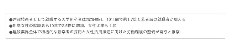 建設業各社は厳しい人材不足が続く建設技術者を確保するために、人材の大きな供給源となっている大学新卒者の獲得に精力的に取り組んでいることが推察されます。また、建設技術者として就職する女性が増加している背景には、建設業界全体で、女性活用推進に向けた労働環境の整備などが積極的に進められていることがあると考えられます。