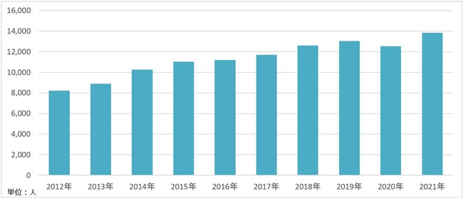 大学新卒で建築・土木・測量技術者(以下、建設技術者)として就職した学生数について、過去10年間の推移をみると、2012年卒の8,213人から2019年卒の13,051人まで8年連続で増加しました(図表1)。2020年は東京オリンピック・パラリンピック関連の建設需要が落ち着いたこともあり、12,539人(前年比3.9%減)となりましたが、2021年は再び増加に転じて13,837人(同10.4%増)となるなど、この10年間で約1.7倍になりました。このことから大学新卒で建設技術者として就職する学生数は増加傾向にあることが分かります。