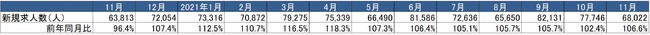 公共職業安定所(ハローワーク)における新規求人数は68,022人(同106.6%)と前年同月比で12カ月連続増加しました(図表4.)。