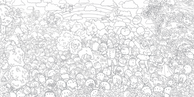 本の後半では、さがし絵での可愛い世界観がそのままぬり絵に。親子で一緒に楽しめるのはもちろんのこと、「大人のぬり絵」としても納得のいくクオリティです。