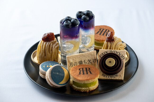 スイーツは、劇中にも登場していた、どら焼きをリーガロイヤルホテル東京スタイルで洋風に仕上げた「ピスタチオのどら焼き風サンド」をはじめ、映画タイトルにもある“月”に見立てたコーヒー味の「マカロン・キャフェ」、バラとスミレの花びらを使い「完璧な愛」という名前を持つリキュールでほんのりと香り付けしたグラスデザートなど、全8種をご用意。このほか、キャンパスボードを模したサブレは、日替わりでデザインを変えて提供します。