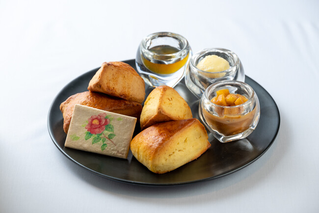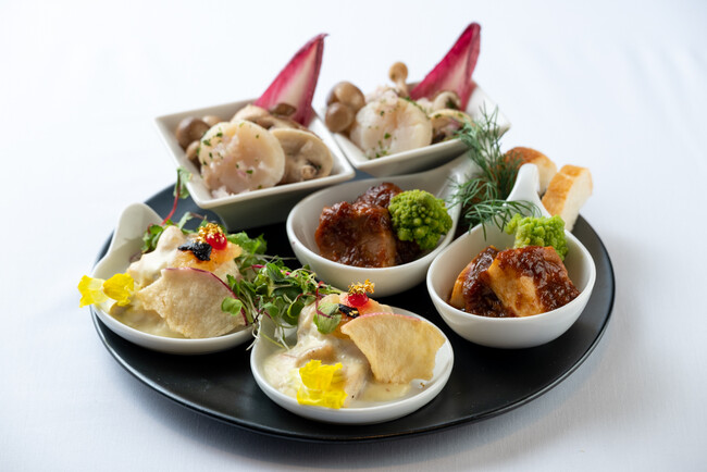 セイボリーは、映画の舞台となった青森県の名産品よりヒントを得た「チキンのフリカッセ シードル風味」や「ホタテと茸のマリネのサラダ」など、全3種を盛り合わせてご用意。