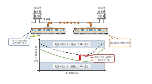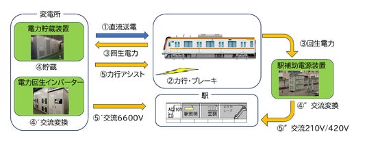 ※1 電車がブレーキをかけた際に電車の運動エネルギーを電気エネルギーに変換することで回生電力を発電します。発電した回生電力は、付近を走行する電車に供給し、使用エネルギーを削減していますが付近を走行する電車がいない場合、回生電力の行き場がないためそのエネルギーを活用できておりませんでした。