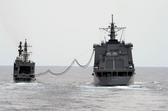 護衛艦『やまぎり』(左)に燃料などの補給を行う補給艦『おうみ』。艦同士の適切な距離を維持し、速力を合わせる高度な操艦技能が超絶ワザだ
