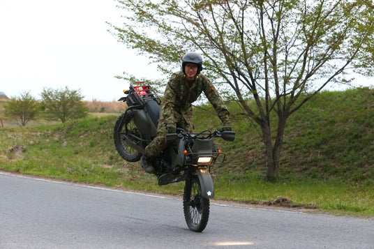 後輪を持ち上げ静止するジャックナイフ。1回で成功する自衛官に対し、初チャレンジの川井委員はコツをつかむまで苦労した超絶ワザ