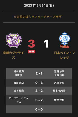 2023-12-25 一般社団法人Tリーグ ノジマTリーグ 2023-2024シーズン 公式戦 12月24日開催 京都カグヤライズ vs 日本ペイントマレッツ 試合結果 Tweet ノジマTリーグ 2023-2024シーズン 公式戦 12月24日開催 「京都カグヤライズ vs 日本ペイントマレッツ」の試合は、京都カグヤライズが3-1で勝利しました。 企業プレスリリース詳細へ PR TIMESトップへ 公式ツイッター Follow @Straightpress 最新情報をTwitterで受け取ろう! 公式フェイスブックページ 最新情報をFacebookで受け取ろう! 前の記事 一覧へ戻る 次の記事