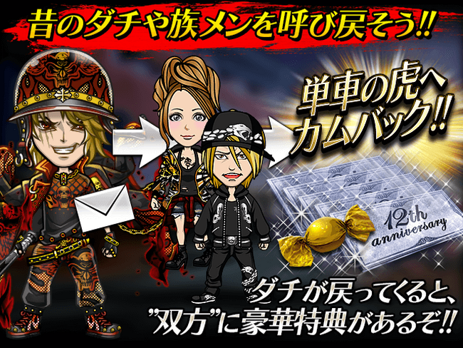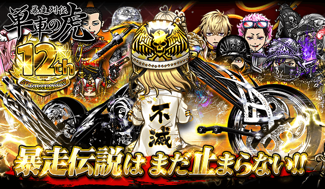 株式会社DONUTS(東京都渋谷区、代表取締役:西村啓成)が運営するリアルタイム暴走族バトルゲーム『暴走列伝 単車の虎』は、リリース以来、ヤンキーゲームを代表する長期人気タイトルとして多くのユーザーに支持され続けています。このたび12周年を記念して、超貴重なアバターや記念バイク等が手に入る「12周年ガチャ」や、過去に本ゲームで遊んでいたプレイヤーに「お誘い」のメッセージを送ってカムバックすると互いに報酬がもらえる「12周年記念!!カムバックキャンペーン」など、豪華7大キャンペーンを開催いたします。