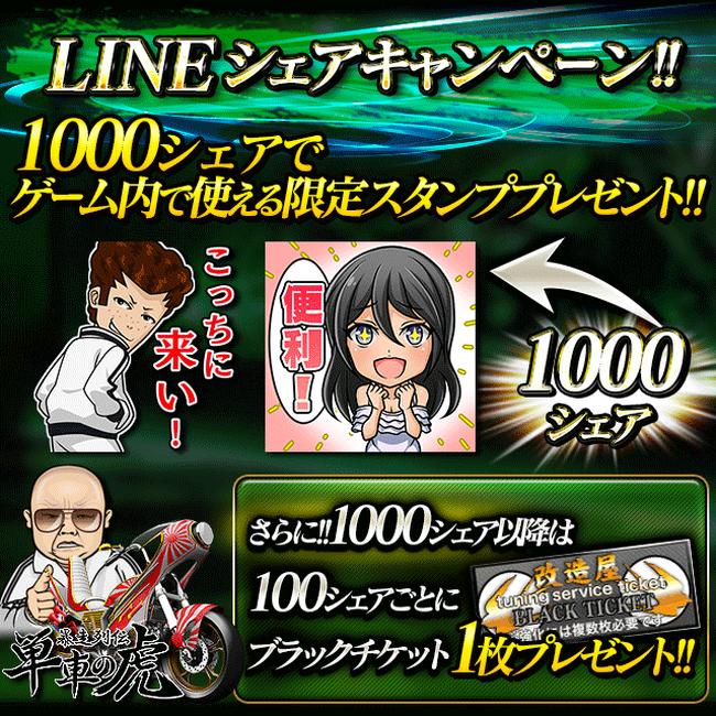 キャンペーン中にLINEでシェアした回数に応じて、限定スタンプなど豪華な報酬が手に入ります!