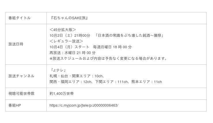 JCOM株式会社(J:COM、本社:東京都千代田区、代表取締役社長:石川 雄三)は、全国1,400万世帯で視聴可能なJ:COMのコミュニティチャンネル「J:テレ」で10月より毎週月曜日(18:00~18:30)に株式会社ワタナベエンターテインメント(東京都渋谷区、代表取締役社長:渡辺 ミキ)制作のバラエティ番組『石ちゃんのSAKE旅』の放送を開始します。