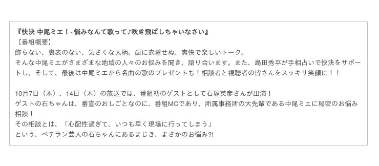 また、これを記念して、「J:テレ」で7月より毎週木曜日(20:00~20:30)に初回放送中のJ:テレオリジナル番組「快決 中尾ミエ!~悩みなんて歌って♪吹き飛ばしちゃいなさい」の10月7日(木)14日(木)の放送回に、石塚英彦がゲスト出演します。
