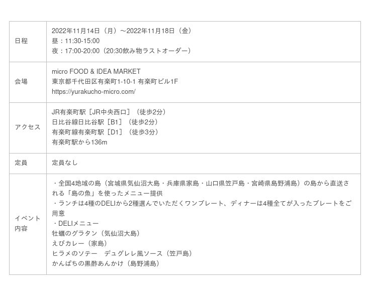 特定非営利活動法人離島経済新聞社は、2022年11月14日(月)~11月18日(金)に、micro FOOD & IDEA MARKET(東京都千代田区)とのコラボレーションイベント”ritokei×有楽町 micro FOOD & IDEA MARKET「島の魚食WEEK」”を開催します。