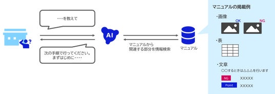 ツルハHDのマニュアルには、社内ナレッジが画像や表、文章などさまざまな形式で掲載されています。今回開発した社内ナレッジ検索システムは、テキストに限らず図や表なども理解する技術を使っており、膨大かつ複雑なマニュアルから必要な情報へ素早くたどり着ける環境を実現しています。さらにチャット形式を採用しており、従業員が文章で質問すると文章で回答する仕組みです。専門知識を必要とせず、誰でも使いやすい設計になっています。これにより、情報探索にかかる時間を短縮し、従業員の生産性向上に貢献します。2026年1月末から展開を開始し、2月末には1,000店舗以上への展開を完了しました。