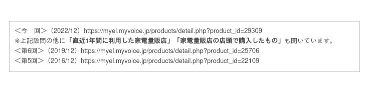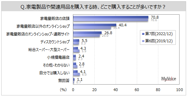 マイボイスコム株式会社(東京都千代田区、代表取締役社長:高井和久)は、7回目となる『家電量販店の利用』に関するインターネット調査を2022年12月1日~5日に実施しました。調査結果をお知らせします。