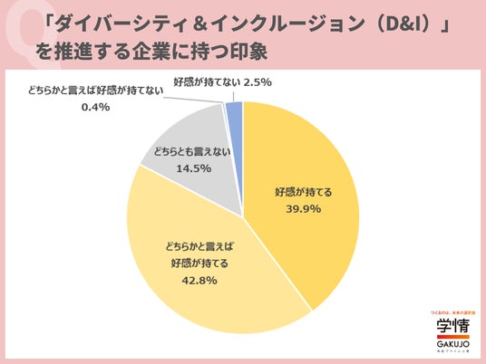 「ダイバーシティ&インクルージョン(D&I)」を推進する企業に持つ印象について、「好感が持てる」と回答した学生が39.9%に上りました。「どちらかと言えば好感が持てる」42.8%を合わせると、8割以上の学生が、「ダイバーシティ&インクルージョン」を推進する企業は好感が持てるとしています。