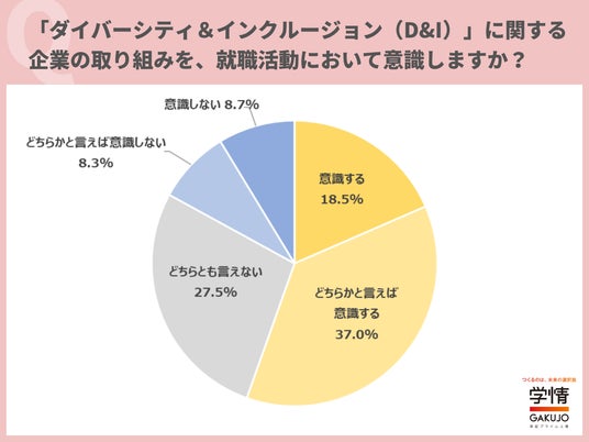 株式会社学情(本社:東京都中央区)は、2026年3月卒業(修了)予定の大学生・大学院生を対象に、インターネットアンケートを実施。今回は、「ダイバーシティ&インクルージョン(D&I)」について調査しました。8割以上の学生が、「ダイバーシティ&インクルージョン」を推進する企業は好感が持てると回答。就職活動において「ダイバーシティ&インクルージョン」に関する企業の取り組みを意識していると回答した学生も、半数に上りました。「多様性を大切にしている企業のほうが、成長していくと思う」「様々な考え方を持った人と働けて、自分自身も多様な視点が得られそう」「D&Iを唱えているだけではなく、取り組みとして実践しているかを意識している」といった声が上がっています。