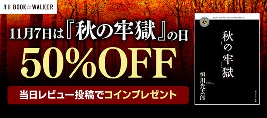 株式会社ブックウォーカー(本社:東京都千代田区 代表取締役社長:森田岳)が運営する国内最大級の本のレビュー投稿サイト「読書メーター」では、毎年恒例企画である「11月7日『秋の牢獄』特集」として、2024年11月7日(木)に同作品のレビューを投稿すると電子書籍購入に使える100円分のコインがもらえるキャンペーンを実施します。また、2024年11月1日(金)~11月7日(木)の期間中、総合電子書籍ストア BOOK☆WALKER(以下、BOOK☆WALKER)で使える『秋の牢獄』50%OFFクーポンも配布します。
