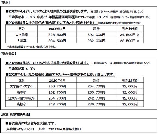 12,000円のベースアップなどを含めて、東急・東急電鉄全従業員平均で6.0%の賃金引き上げを行い、2026年4月入社の大卒初任給は、東急(総合職)で30万4500円、東急電鉄(鉄道エキスパート職)で26万6700円となります。あわせて、2025年度の好業績を踏まえた従業員還元として、賞与の増額に加え、東急・東急電鉄全従業員に平均20万円の特別賞与を支給します。