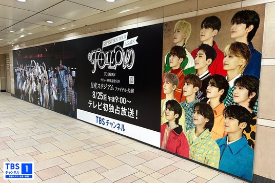 株式会社TBSテレビ(本社:東京都港区、代表取締役社長:龍宝正峰、以下TBS)が運営するCS放送「TBSチャンネル1 最新ドラマ・音楽・映画」では、世界的人気を誇るグローバルグループSEVENTEENのデビュー後最大規模となる初スタジアムツアー『SEVENTEEN TOUR 'FOLLOW' AGAIN TO JAPAN』から、2024年5月26日(日)に行われた日産スタジアム・ファイナル公演をテレビ初独占放送する。これを記念して、本日8月19日(月)から放送当日8月25日(日)までの一週間期間限定で、東急東横線「渋谷駅」と東京メトロ半蔵門線「表参道駅」ヒルズ口エリアでSEVENTEENの大型広告が登場する!