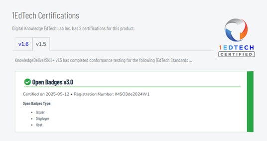 導入実績3000超を誇るeラーニング専門ソリューション企業、株式会社デジタル・ナレッジ(本社:東京都台東区、代表取締役社長:はが弘明)が提供するデジタルバッジシステム『KnowledgeDeliverSkill+(ナレッジデリバースキルプラス)』は、1EdTech Consortium Inc.(以下、1EdTech)が定める国際技術標準「オープンバッジ3.0」におけるHostの認定を取得しました。