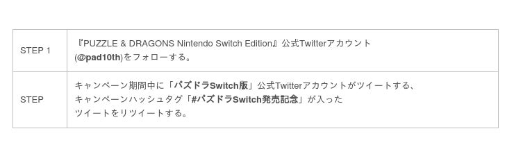 『パズドラSwitch』の発売決定を記念して、『パズドラSwitch』公式Twitterアカウントにてフォロー&リツイートキャンペーンを開催いたします。「パズドラSwitch」公式アカウント(@pad10th)をフォローして、キャンペーンハッシュタグ「#パズドラSwitch発売記念」が入ったツイートをリツイートしてください。リツイートしていただいた方の中から抽選でNintendo Switchなどをプレゼントいたします。