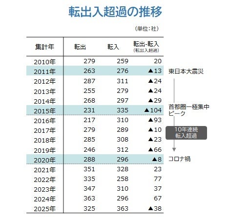 この結果、転出企業数から転入企業数を差し引いた「転出入超過」は、38社の転入超過となった。転入超過の規模は、最も多かった2015年(104社の転入超過)の約3分の1であったものの、コロナ禍の2020年(8社)以来、5年ぶりの転入超過となった。
