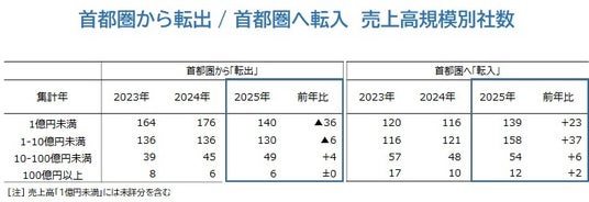 帝国データバンクは、2025年に首都圏(東京・神奈川・千葉・埼玉:1都3県)⇔地方間をまたいだ「本社所在地の移転」が判明した企業(個人事業主、非営利法人等含む)について、保有する企業概要データベースのうち業種や規模が判明している企業を対象に分析を行った