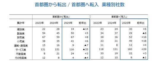 2025年に地方から首都圏へ本社を移転した企業は過去最多の363社で、首都圏から地方への移転は325社となり、首都圏では38社の転入超過となった。大阪府や福岡県などから多くの企業が首都圏へ移転、業種別ではサービス業が顕著だった。コロナ禍が収束し、対面での営業活動が再開するなか、取引先や若年層人口の多い首都圏へ、規模拡大を目指す中小企業による移転の動きが再び高まりつつある。