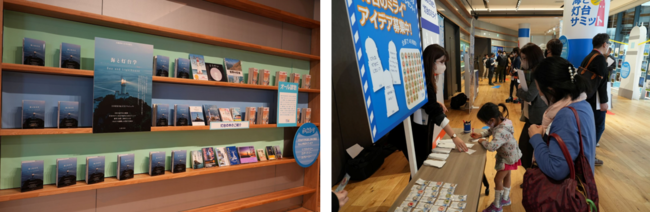 海と灯台サミットの開催に合わせて、会場のWITH HARAJUKU HALL ホワイエでは「よみもの」というテーマで海と灯台サミット特設ギャラリーの展示が行われました。全国の著名な灯台が紹介されたクイズや灯台オブジェのほか、海と灯台の物語や書籍、親子で楽しめる灯台のペーパークラフトや灯台グッズが販売され、見て回るだけで灯台の興味や理解が深まる内容で来場者は足を止めてそれぞれの展示物をじっくり楽しんでいる様子でした。