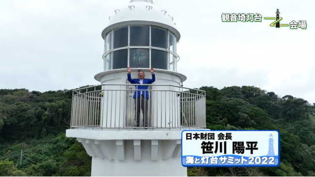 日本財団 笹川会長は日本の灯台第一号である三浦半島・観音埼灯台から中継で登場すると、その歴史や灯台そのものへの想いを述べて、「灯台を中心に様々な社会的、文化的な遺産がたくさんあると思うが、そういうことも皆さんで話し合われたら嬉しく思います。灯台は歴史あるいは文化、そして私たち日本人にとってかけがえのない海洋文化資産だが、あまり知られなくなってきています。もう一度これを皆様方とともに話し合って理解を深めていきましょうというのが、日本財団 海と日本プロジェクトの1つなので、有意義な時間を過ごしていただければ幸いです。今日は灯台の過去から現在、未来に向けて灯台を中心に活発にお話が進むことを期待しています。」とサミット来場者への期待を話し、日本財団と文藝春秋の共同で制作された書籍「海と灯台学」についても紹介しました。