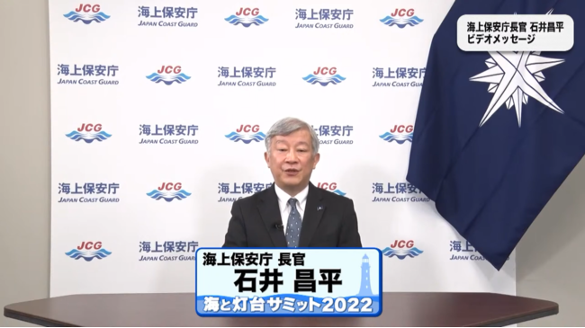 また、海上保安庁 石井長官はビデオメッセージで登場し、「本日のサミットは、灯台の未来がテーマと聞きました。灯台の保守や管理は、以前は灯台守と呼ばれた私どもの職員が、灯台の敷地に住んで行っていました。その後、遠隔監視の技術を導入するなどして合理化を進め、全国の全ての灯台の無人化が16年前に完了しました。地域の皆様の力を借りて、灯台は守り、育てられています。昨年には法律改正もして、灯台のペンキ塗りや錆落としなどの簡単な修繕であれば、地域の皆様にも行って頂ける制度を新しく作りました。その制度に基づき既に20を超える団体を指定し、それらの団体には灯台についての構造や設計の図面などの情報も提供するなどして、その活動を支援しています。本日のトークセッションでは、様々な分野、年代の方々に、灯台の未来について話し合って頂くと聞いています。灯台について本来の役割に加えて、新しい価値が見い出され、地域の皆様、地域を超えた皆様にさらに注目していただけるきっかけの一つとなれば、大変ありがたく思います。」とご挨拶をいただきました。