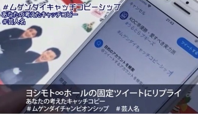 募集方法:ヨシモト∞ホール公式Twitterの応募要項が記載してある固定ツイートに、ハッシュタグ“#ムゲンダイキャッチコピーシップ”と“#芸人名”をつけてリプライ。