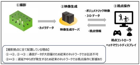 本協業により、撮影場所にとらわれず、遠隔地からでもボリュメトリックビデオの生成・視聴・操作が可能になります。これにより、撮影拠点(スタジアム等)に映像生成サーバを持ち込む必要がなくなり、機材配置の最適化によるコスト削減が期待できます。さらに、視聴者は遠隔地でもボリュメトリック映像を視聴・操作でき、好きな角度や視点から楽しむ新しいエンターテインメント体験が可能になります。