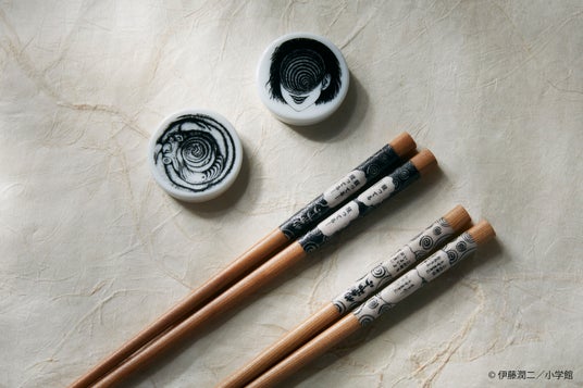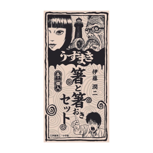 箸には斎藤秀一のセリフを、箸おきにはうずまきと化した斎藤敏夫と黒谷あざみをあしらいました。箸と箸おき共に各2つずつの魅惑のセットです。あなたの食事の時間をたちまち『うずまき』ワールドに誘います。
