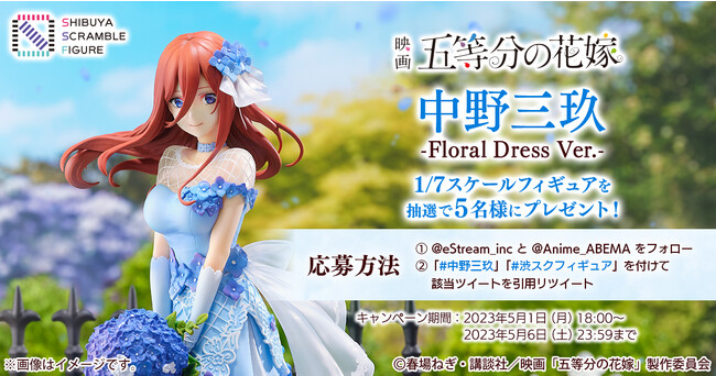 今回の予約販売開始を記念し、Twitterキャンペーンにご参加頂いた方の中から中野 三玖 -Floral Dress Ver.- 1/7スケールフィギュアを抽選で5名様にプレゼントいたします。
