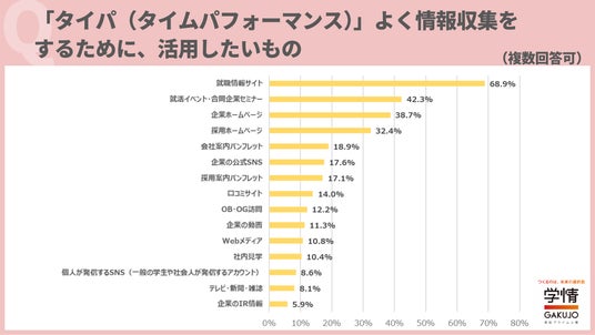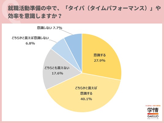 株式会社学情(本社:東京都中央区)は、2026年3月卒業(修了)予定の大学生・大学院生を対象に、インターネットアンケートを実施。今回は、「タイパ(タイムパフォーマンス)」について調査しました。約7割の学生が就職活動において「タイパ」を意識すると回答しています。「限られた時間を有効活用したい」「まだ志望業界や企業が決まっていないので、多くの企業について調べるために効率を重視したい」「大学の研究や部活、アルバイトなどやりたいことがたくさんあるので、就職活動も効率的に行うことを意識している」といった声が上がりました。また、タイパよく情報収集をするために活用したいものは、「就職情報サイト」が68.9%で最多でした。「就職情報サイトは、一つのサイトで複数の企業の情報を得ることができる」「スマホやパソコンでアクセスしやすいツールを活用したい」「時間や場所を選ばずに見ることができるので、効率良く情報収集ができると思う」といった声が上がっています。