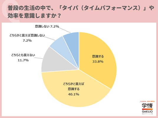 普段の生活の中で、タイパや効率を「意識する」と回答した学生が33.8%に上りました。「どちらかと言えば意識する」40.1%を合わせると、7割以上の学生が普段の生活の中で「タイパ」を意識していることが分かります。